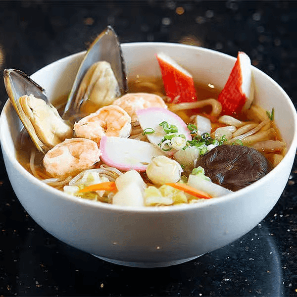 Scallops, shrimps, mussels, imitation crab stick, fish cake, fungus mushroom, bamboo shoots, corn, bean sprouts, and with homemade seafood broth