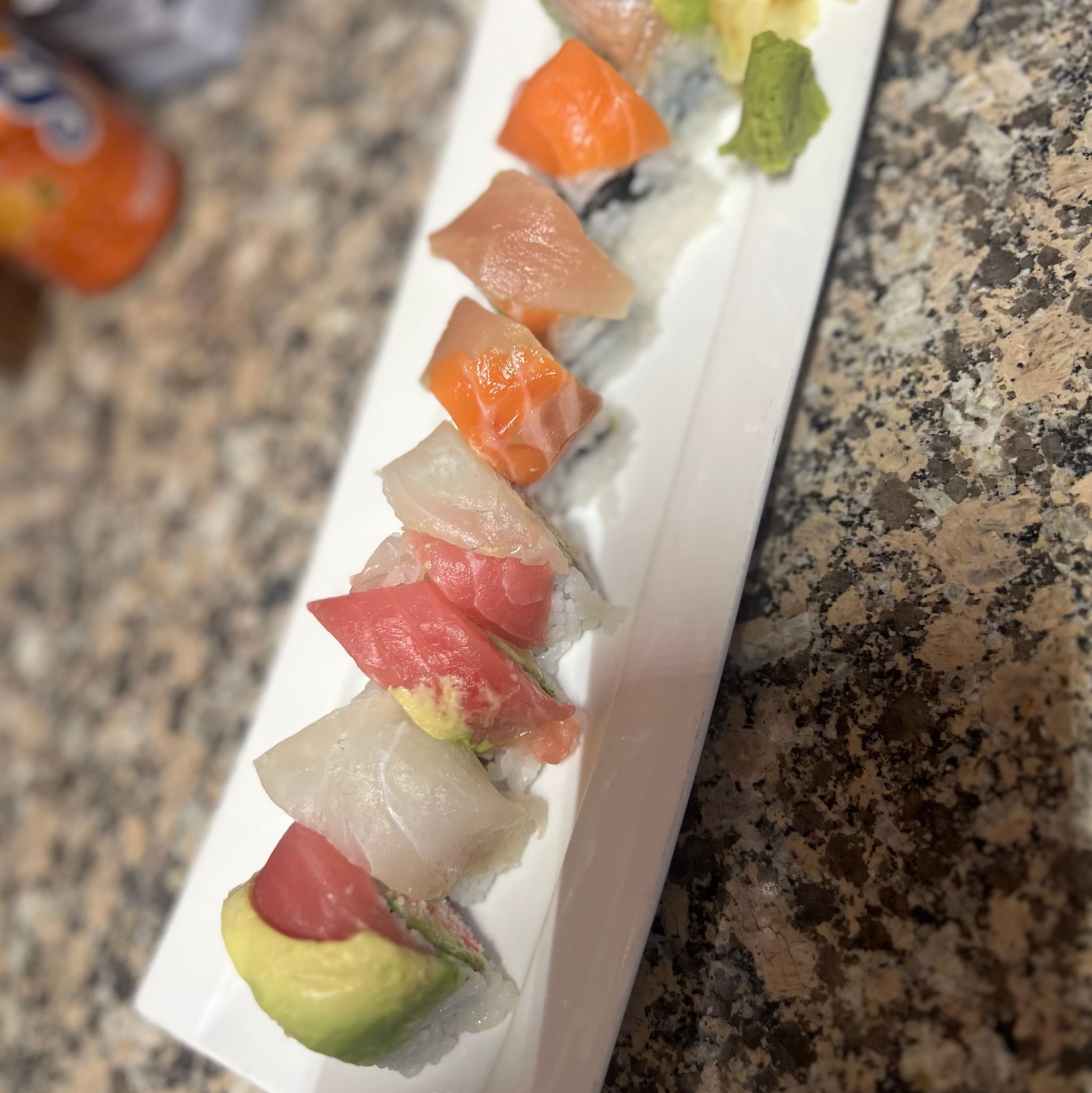 Avocado, imitation crab meat, sliced hamachi, spicy mayo, and sriracha on top