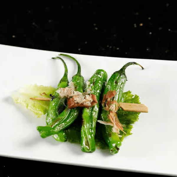 Fried pepper with cream cheese, salmon, and a little sprinkle of tobiko