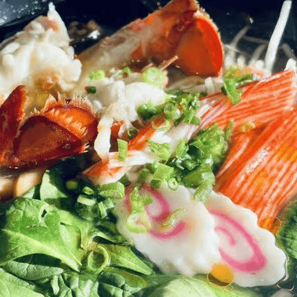 Lobster, imitation crab stick, fish cake, fungus mushroom, bamboo shoots, corn, bean sprouts, and with homemade seafood broth