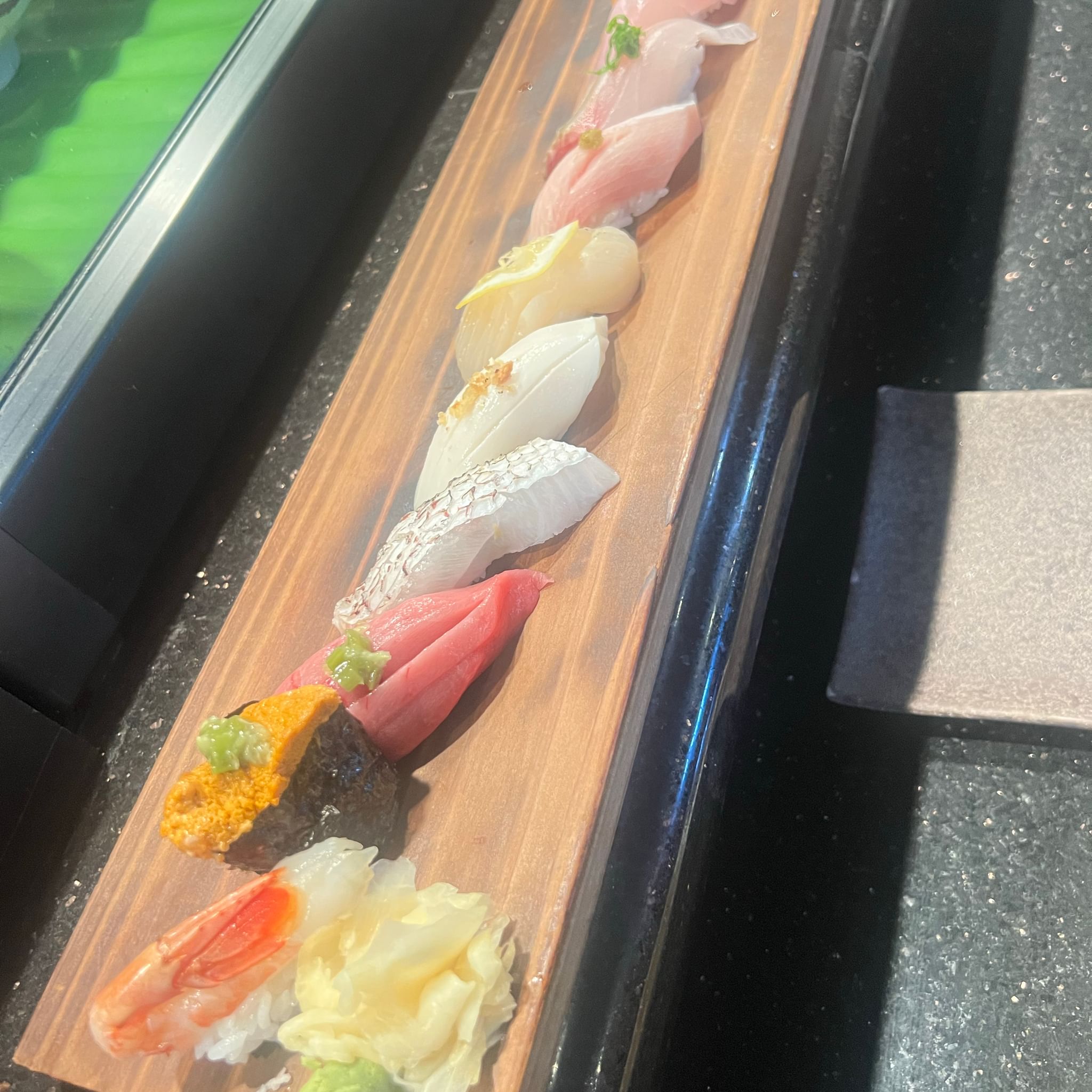 Omakase (10 pc nigiris) broadway; cherry blossom; godzilla; mango tango; dragon; california; includes 2 edamame; 2 chicken karaage & 6 miso tofu soup