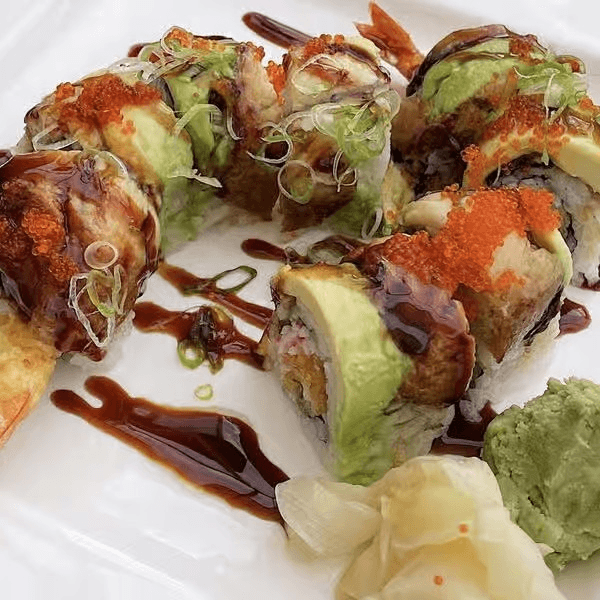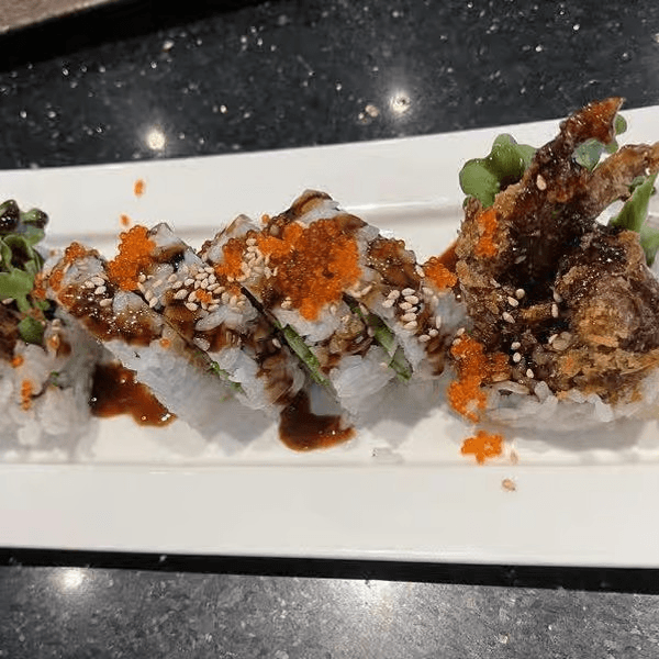 Eel, avocado, imitation crab, shrimp tempura, fried cucumber
